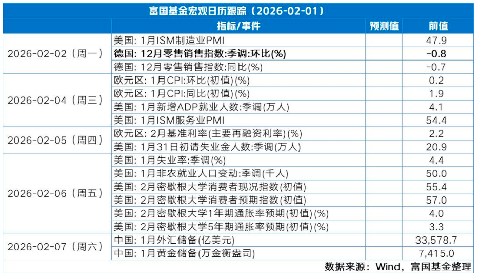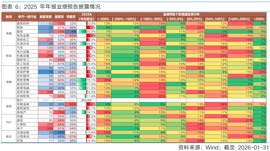国内方面,2025年年报预告密集披露叠加监管层引导市场理性回归,缩量调整后风险得到进一步释放。截至2026年1月31日,A股全部上市公司中(剔除2025年及以后上市的公司)披露率达到55.7%,预喜率为36.7%,业绩风险逐渐得到释放。按照披露口径,中位数法下全A上市公司2025年净利润同比增速为17.5%,整体法下为38.2%,均较2025年前三季度累计净利润同比增速更高,上市公司盈利修复趋势进一步验证,结构上AI产业趋势(通信、电子、机械设备等)、涨价链(有色、化工等)、出海(电力设备、医药等)的景气得到进一步确认,本周算力硬件也在业绩催化下获得资金青睐。虽然本周沪深300等宽基ETF仍维持放量卖出的趋势,但连续三周大量卖出后后续力度或趋缓。向后看,随着年报业绩预告披露结束,A股市场再度进入上市公司业绩、经济数据的真空期,2月产业层面将迎来密集催化,3月两会前政策预期对风险偏好或亦有提振,春季行情仍有纵深演绎的空间。