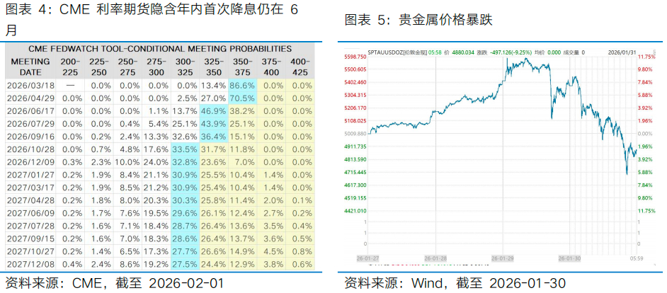 本周市场最受关注便是大宗商品尤其是有色金属的波动,特朗普提名沃什为下任美联储主席,预期偏鹰的立场引发风险资产走弱和贵金属价格承压,也带来了周五A股有色板块的暴跌。当地时间1月28日,美联储宣布维持联邦基金利率目标区间在3.5%-3.75%不变,在连续三次降息25个基点后暂停行动,符合市场预期。当地时间1月30日,美国总统特朗普在社交媒体上正式宣布,提名前美联储理事凯文·沃什为下任美联储主席。由于沃什在2006-2011年担任美联储理事期间立场偏鹰,加之其重视通胀管控、并主张通过缩表创造降息空间,业内人士普遍认为沃什在货币政策方面的立场比其他候选人都更加鹰派,推动美元与美国长端利率上行、风险资产走弱,商品市场全球震荡,贵金属集体跳水。自北京时间1月30日下午开始,黄金、白银价格便出现大幅波动,北京时间1月31日凌晨,恐慌性抛售席卷全球贵金属市场。截至收盘,现货黄金创1980年4月1日以来最大单日跌幅,回吐本周所有涨幅,预计A股盘后时间的暴跌仍对下周有色行情形成扰动。不过短期大幅波动不意味着有色金属行情的终结,核心支撑在于当前仍处降息周期,新任美联储主席相对“鹰派”的立场并非意味着不降息,预计“降息”趋势仍然具备确定性只是时点会有变化。