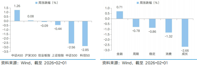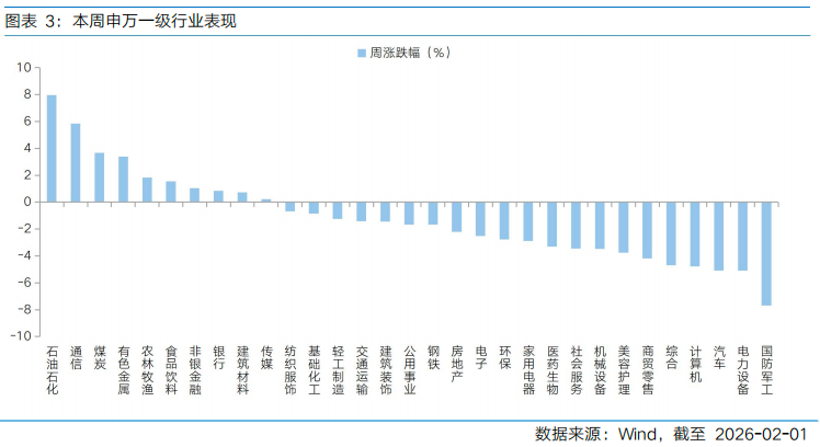 本周A股市场呈现震荡调整态势,成交维持高位但赚钱效应表现不佳,周度日均上涨家数占比约为三成。结构上,具备业绩支撑算力硬科技和以石油石化、有色金属为代表的资源品表现靠前,食品饮料、农林牧渔、煤炭等前期滞涨板块也迎来阶段表现。不过,本周贵金属波动尤为剧烈,虽然周度涨幅榜靠前,但周五在外围金银价格大跌影响下迎来暴跌。此外资金轮动下,前期热门的商业航天、太空光伏等概念板块也大多熄火。宽基指数看,本周上证指数下跌0.44%,创业板指下跌0.09%,沪深300上涨0.08%,中证500下跌2.56%,中证A50上涨1.26%,科创50下跌2.85%。风格上,金融、周期表现相对较好,成长、消费表现较差。从申万一级行业看,表现相对靠前的是石油石化(7.95%)、通信(5.83%)、煤炭(3.68%)、有色金属(3.37%)、农林牧渔(1.82%);表现相对靠后的是国防军工(-7.69%)、电力设备(-5.10%)、汽车(-5.08%)、计算机(-4.77%)、综合(-4.68%)。从Wind热门概念板块来看,表现相对靠前的是黄金珠宝(12.16%)、光模块(CPO)(10.07%)、光通信(7.70%)、油气开采(7.37%)、生物育种(7.11%);表现相对靠后的是卫星互联网(-9.86%)、商业航天(-9.22%)、卫星导航(-8.69%)、军工信息化(-8.47%)、锂矿(-7.49%)。