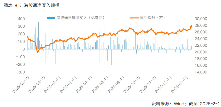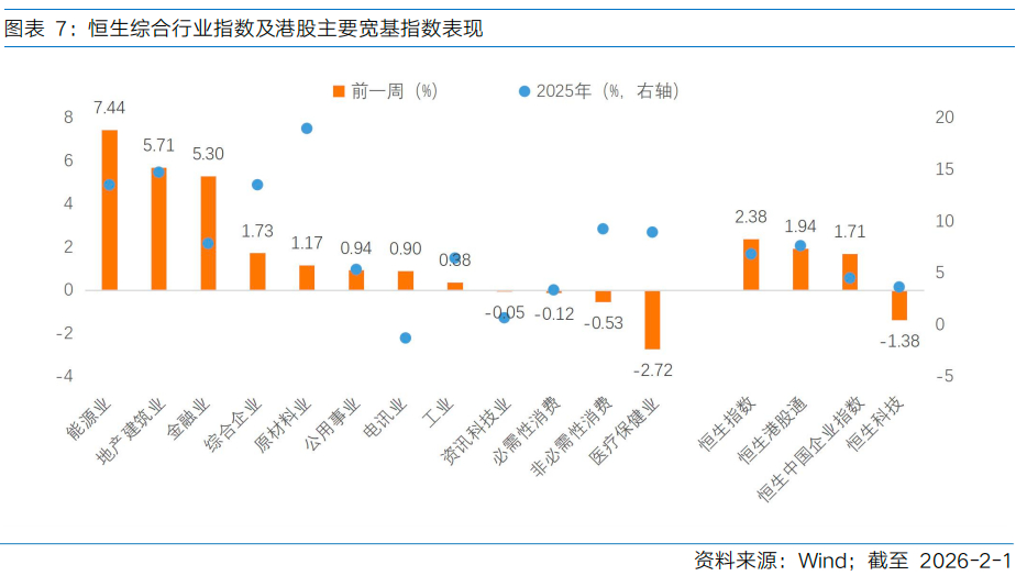 过去一周,港股市场呈现结构性上涨态势,主要指数表现分化。恒生指数全周上涨2.38%,恒生中国企业指数同步走强,涨幅达1.71%,而恒生科技指数则逆势下跌1.38%。结构上,受益于宏观环境与政策预期的传统价值板块表现强势,能源业、地产建筑业、金融业涨幅居前,周涨幅分别达到7.44%、5.71%、5.30%。另一方面,医疗保健业、非必需性消费、必需性消费表现疲软,分别下跌2.72%、0.53%、0.12%。资金面方面,南向资金持续保持净流入态势,全周合计净买入27.08亿港元,为港股市场提供了稳定的资金支撑。从驱动逻辑来看,港股本周的结构性行情主要受内外因素共同影响。海外层面,美联储维持利率不变,美联储人事提名带来紧缩预期升温;国内层面,地产政策宽松预期叠加流动性合理充裕叠,推动顺周期板块走强。领涨板块中,能源业受益于国际油价上涨及全球能源需求复苏预期,板块估值持续修复;地产建筑业得益于国内地产调控政策的进一步放松,房企融资环境改善,行业预期显著修复。