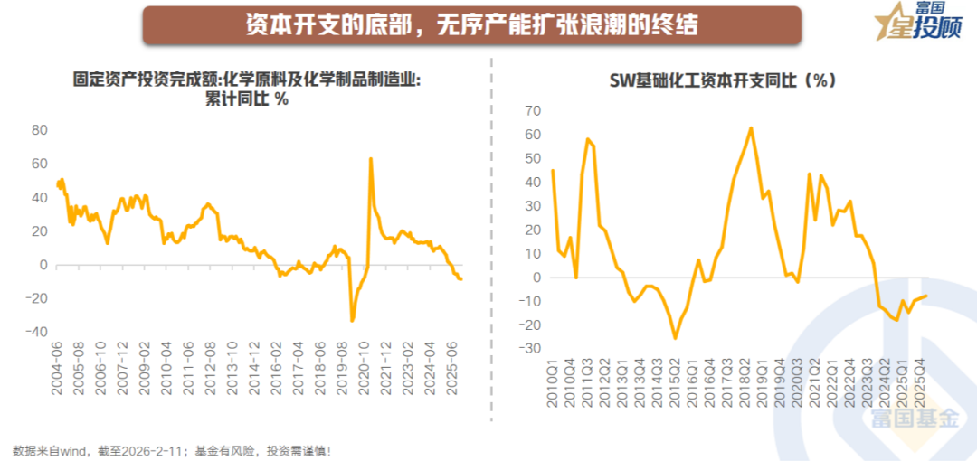 历经近四年的调整,化工行业已呈现出典型的周期底部特征。首先,资本开支的底部,标志着上一轮无序产能扩张浪潮的终结。行业固定资产投资额自2025年中开始转负,2025年Q3资本开支同比下滑10%,且自2024年以来连续多季度负增长,扩产意愿降至冰点。