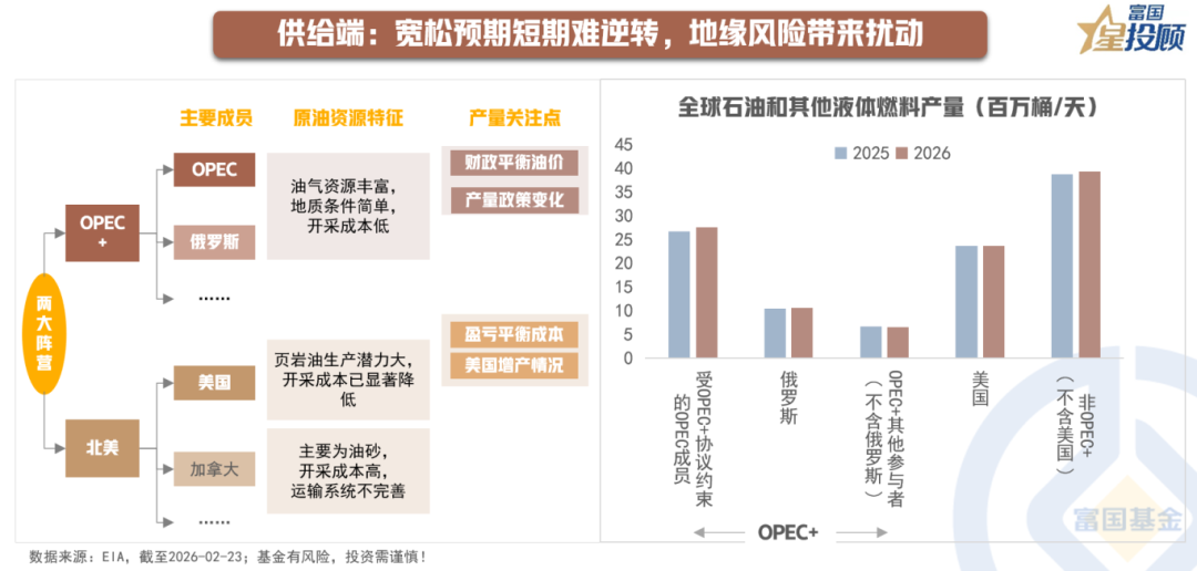 从整体格局看,美国、沙特阿拉伯、俄罗斯是全球原油市场的三大主要玩家,也构成了现阶段原油供给端的两大阵营——OPEC+与北美阵营。虽然OPEC+宣布在一季度暂停增产,但其在2025年的累计增产已相当显著,非OPEC+方面,美国增长或有放缓但仍将维持高位,巴西和圭亚那等南美地区新项目投产较多。综合来看,2026年供应端的“宽松预期”将持续存在。EIA预计2026年全球石油供应将增加156万桶/天至1.079亿桶/天,全球石油和其他液体燃料消费量将增加120万桶/天至1.048亿桶/天,即全球原油约有310万桶/天的供应过剩。不过,地缘政治风险仍将对2026年供需平衡造成重要影响,因此供给端预期仍有较大波动。