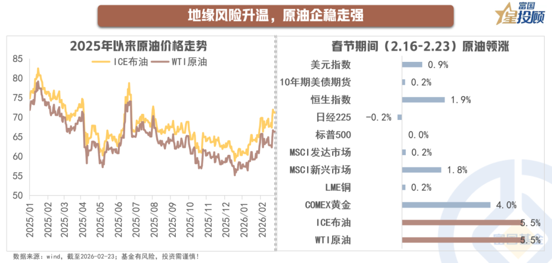 2025年,在供应预期宽松、需求增长乏力、库存高位和局部地缘政治事件催化的背景下,全球原油期货市场整体呈现宽幅震荡、阶段性下行的格局。12月中旬以来,由于需求端季节性增长、天气事件扰乱全球原油供应,加之中东地缘紧张局势升温等,原油市场呈现"V型"反弹。春节前一周,随着中东地缘风险逐渐降温,叠加北半球冬季取暖需求旺季趋于尾声,原油期货价格再度弱势下行。而春节期间,由于海外市场对于美国与伊朗开战的预期快速上升,国际油价明显走高,并领跑各类资产。截至2026年2月23日,布伦特原油期货价格已突破70美元/桶,WTI原油期货价格则升至65美元/桶以上,创下近半年新高。