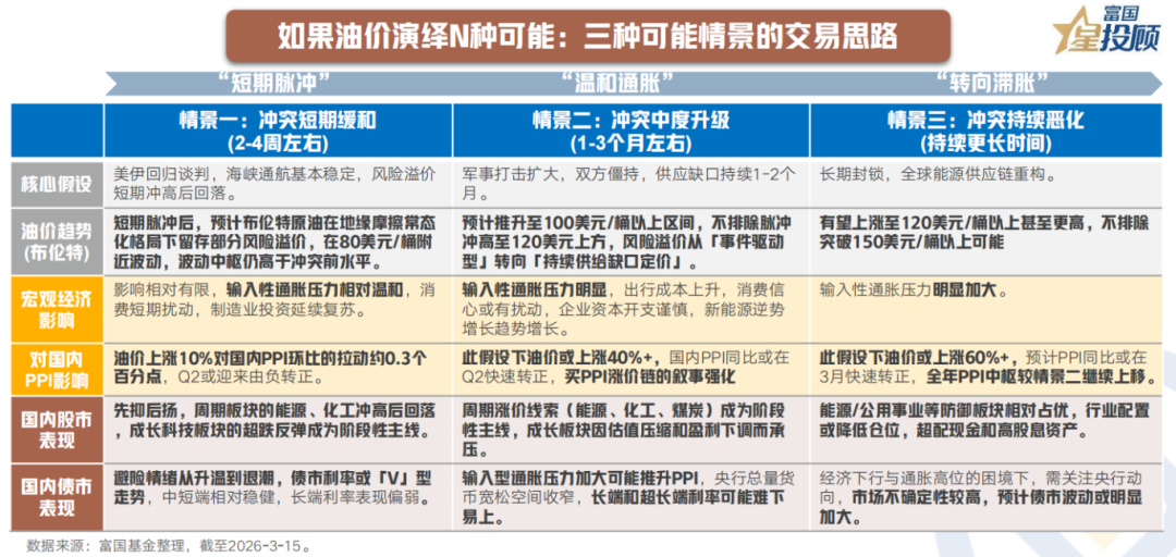 后续油价走势仍取决于冲突的持续时间与强度,那么不同情景下的地缘、油价和资产表现将如何演绎?我们通过划分冲突情景,复盘历史上几种由地缘衍生供给冲击引发的油价上涨情景,以期寻找部分相同的韵脚。