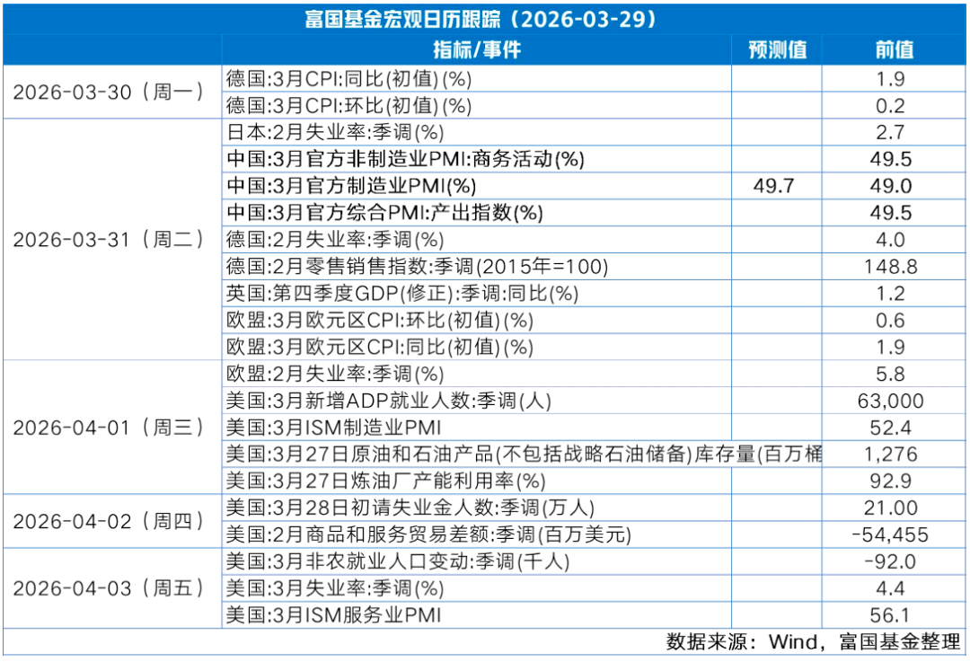 (1)美国经济滞胀风险上升。3月PMI初值降至51.4,创11个月新低,通胀压力显著上升,投入成本增速创10个月新高,企业转嫁成本给消费者的价格增速创2022年以来新高,而企业成本上涨主要受能源成本上升以及中东冲突导致的供应链中断影响。劳动力市场方面,就业人数一年多来首次下降。密歇根大学3月消费者信心指数降至53.3,对未来一年通胀预期升至3.8%,为2025年4月以来最大月度涨幅。