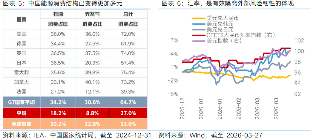 地缘局势复杂多变背景下,中国维护供应链安全、能源安全的能力,可能得到新一轮验证,也可能是股市叙事重回强势状态的契机。本轮地缘波澜是对各国能源结构安全性的一次压力测试,过去十余年中国在降低传统能源依赖度和新能源替代方面取得了长足进步,目前,石油和天然气在中国一次能源消费中的占比仅为27.0%,这一比例远低于G7国家的平均水平(64.7%),也低于全球平均水平(53.0%)。另一方面,过去几年每一次全球重大冲击后,都有中国供应链能力重估的契机,核心在于中国作为全球工业体系最完整的国家,难得安全、稳定的中国资产在极端地缘环境下有一定竞争力凭借战略底牌获得估值加成和安全溢价。从最新数据看,中国出口延续韧性,2月以美元计价出口同比增速为39.6%,增速较1月加快29.6pct,尤其我国机电产品、新能源、高端制造等领域出海优势稳固。在此背景下,已经可以看到的积极现象是,作为隔离外部风险韧性的重要维度,人民币汇率2026年以来受外部冲击的表现较其他能源重度依赖国已经具有一定韧性。中长期来看,鉴于中国充足的外汇储备、稳定的主权信用、完备的制造业全产业链,以及新能源技术的领先,这场压力测试有望加速形成中国成为全球地缘动荡中避风港资产的市场共识。