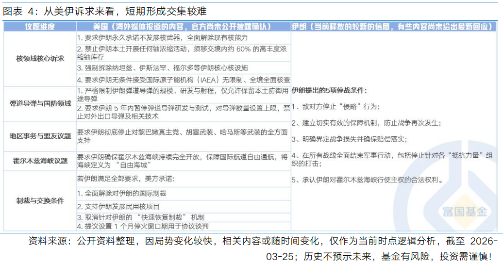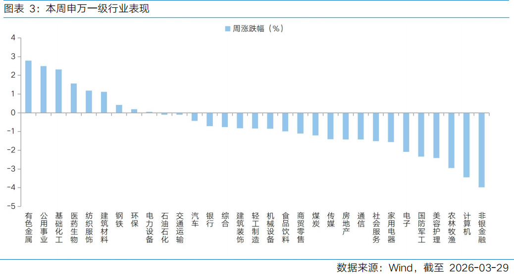 本周中东地缘局势持续演变,沿着特朗普“48小时”通牒→市场恐慌定价→主动释放缓和信号→恐慌情绪修复,地缘局势边际缓和之下,A股在周一暴跌后出现一定修复;不过周末地缘局势再度升级,后续冲突走势、海峡封锁情况等仍有较高的不确定性。当地时间3月21日晚,特朗普发文称向伊朗发出“48小时”最后通牒,要求伊方48小时内开放霍尔木兹海峡,否则将对各类发电厂进行打击。但最终临近时刻,特朗普宣称美伊两方正在会谈,暂停对伊朗发电厂和能源基础设施的一切军事打击,为期五天;美东当地时间3月26日下午(A股周五盘前),特朗普表示针对伊朗能源设施的打击再推迟10天。整个过程再次被市场定义为TACO,叠加周中传出消息部分船只恢复通过霍尔木兹海峡,全球市场在恐慌定价后情绪有所修复,A股在周一暴跌后有所修复,但由于局势复杂性,修复节奏与结构均较为混乱。周五A股盘后再度传来消息,美国与以色列空袭了伊朗胡齐斯坦钢铁厂及伊斯法罕穆巴拉克钢铁厂,穆巴拉克钢铁厂配套的发电厂也遭到了袭击。同时,伊朗军方发布公告表示,位于特拉维夫的以色列军队后勤基地及运输中心遭到伊朗无人机群的攻击。中东局势再度升级,美伊军事冲突从打军事设施升级到打民营设施和工业设施,也门的胡塞武装加入对美伊的战争。目前来看,中东局势正进入深度博弈阶段,美伊在战略诉求层面形成交集,具有一定的困难,因此后续冲突走势、海峡封锁情况等仍有较高的不确定性,使得市场对于油价中枢以及海外走向滞胀或衰退的概率难有稳定预期。短期来看,地缘局势发酵之下流动性风险可能还有上升空间,包括A股在内的全球股市或延续高波动态势。冲突以来,宏观交易层面一直在围绕油价-通胀-加息这条主线交易定价,但中期来看,中美货币政策的最优选择可能都不是紧缩。如果中长期通胀预期指标保持平稳,待短期动性冲击的风险出现缓释迹象,降息预期可能回摆,带来一轮与当下反向的降息交易。