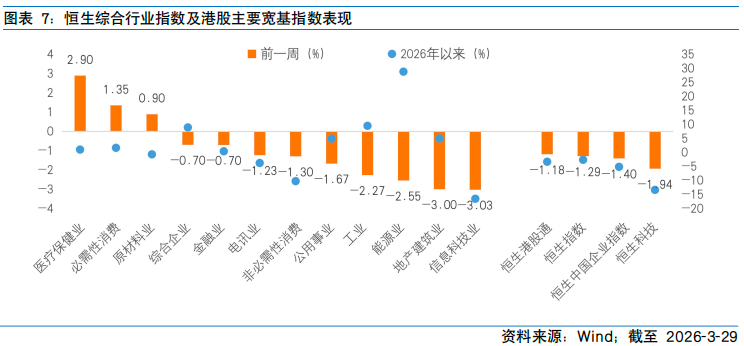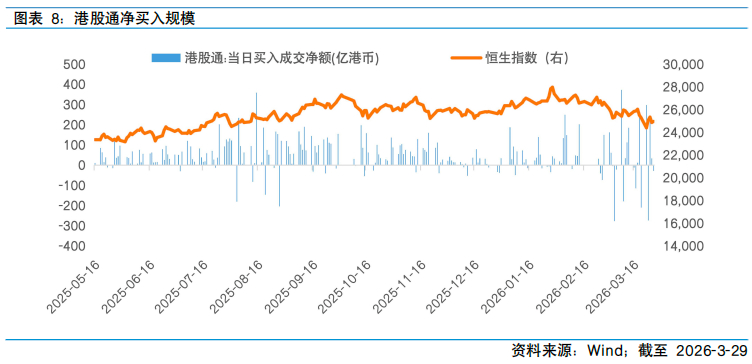 行情走势方面呈现典型的情绪主导特征。周初,受中东冲突可能缓和的乐观情绪提振,恒指一度从低点反弹,然而随着关于美伊谈判进展相互矛盾消息陆续传出,市场对冲突短期解决的信心受到削弱,后半周情绪再度恶化,恒指月末再度失守25000点整数关口。行业来看,医疗保健与必需性消费板块领涨,反映市场在不确定性加剧环境下向防御性板块切换的资金流向;而高油价引发的全球利率中枢上移预期,对高估值成长股形成估值收缩压力,叠加3月为港股上半年解禁高峰,科技板块集中面临减持压力,跌幅居前。