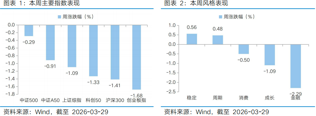 地缘局势持续演变之下,本周包括A股在内的全球股市多维持高波动态势,除小盘指数中证2000、科创200逆势收红外,主要宽基指数集体收跌。结构上,行业轮动依然较快,周期和成长板块整体呈现“跷跷板”行情,其中供给端扰动和需求端向好之下,锂电产业链表现持续性较强。从宽基指数看,本周上证指数下跌1.09%,创业板指下跌1.68%,沪深300下跌1.41%,中证500下跌0.29%,中证A50下跌0.91%,科创50下跌1.33%。风格上,稳定、周期表现相对较好,金融、成长表现较差。从申万一级行业看,表现相对靠前的是有色金属(2.78%)、公用事业(2.50%)、基础化工(2.31%)、医药生物(1.56%)、纺织服饰(1.18%);表现相对靠后的是非银金融(-3.98%)、计算机(-3.44%)、农林牧渔(-2.94%)、美容护理(-2.41%)、国防军工(-2.34%)。从Wind热门概念板块来看,表现相对靠前的是锂矿(16.90%)、盐湖提锂(10.09%)、水电(5.50%)、锂电池(5.34%)、锂电负极(5.22%);表现相对靠后的是保险(-7.57%)、高送转(-7.26%)、射频及天线(-5.02%)、存储器(-5.00%)、光伏(-1.57%)。