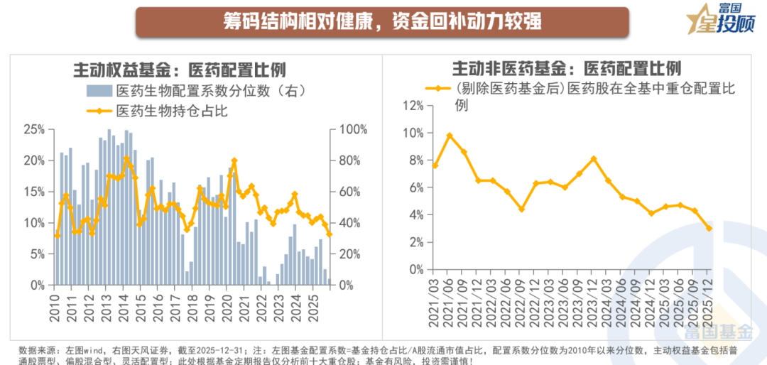 从资金面看,主动权益基金对医药生物的配置系数连续两个季度下行,2025Q4医药生物持仓占比回落至8.2%,配置系数处于2010年以来8%分位水平;剔除医药基金后,医药行业在主动基金中重仓持股比例为3.0%,也处于历史底部。整体来看,医药筹码结构相对健康,随着BD交易的持续落地和盈利预期的兑现,板块或有较强的资金回补动力。