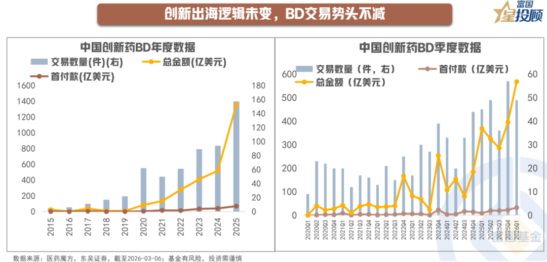 国内创新药企经过多年研发积累和技术平台搭建整合,在全球BD(商业拓展)中吸引力强劲。2025年中国创新药License-out交易总金额突破1300亿美元,创下历史新高;截至3月6日,2026年中国创新药出海BD总金额已经达568亿美元,超过24年全年水平,约占2025年全年的41%,BD交易势头不减。在国内创新药全球竞争力持续加强和海外MNC面临专利悬崖背景下,医药创新出海的产业逻辑并未改变。