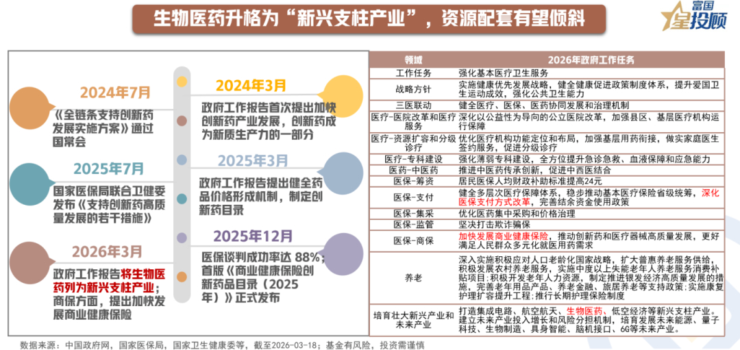2024年创新药首次被单独、明确写入政府工作报告,成为生物医药产业发展的重要转折点;2026年政府工作报告明确将生物医药定位为“新兴支柱产业”,生物医药行业战略地位进一步提升,资源配套有望跟上。在产业定位“升格”的同时,2026年的政府工作报告正式将“加快发展商业健康保险”推至台前,政策对创新药的支持从宏观定位,逐步下沉至支付体系的落地,为创新药企的商业化注入了更为稳定的发展预期。