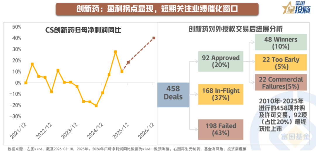 2025年,随着创新品种上市放量以及海外授权里程碑付款密集确认,部分创新药龙头公司率先实现扭亏为盈。短期来看,3-4月步入创新药企业的业绩披露窗口,多家药企有望迎来减亏或扭亏。展望全年及三年维度,随着行业BD交易持续兑现和已BD管线持续推进,以及更多创新药纳入医保后放量,行业基本面改善的格局或将更加清晰,更多创新药企有望过渡到盈利状态。