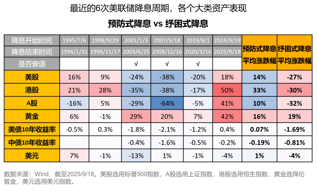 复盘近30年的历史,美联储共有6轮典型降息周期,其中3次属预防式、3次属纾困式。本轮降息被市场普遍视为——“预防式降息”。来看看各类资产实际的表现:
