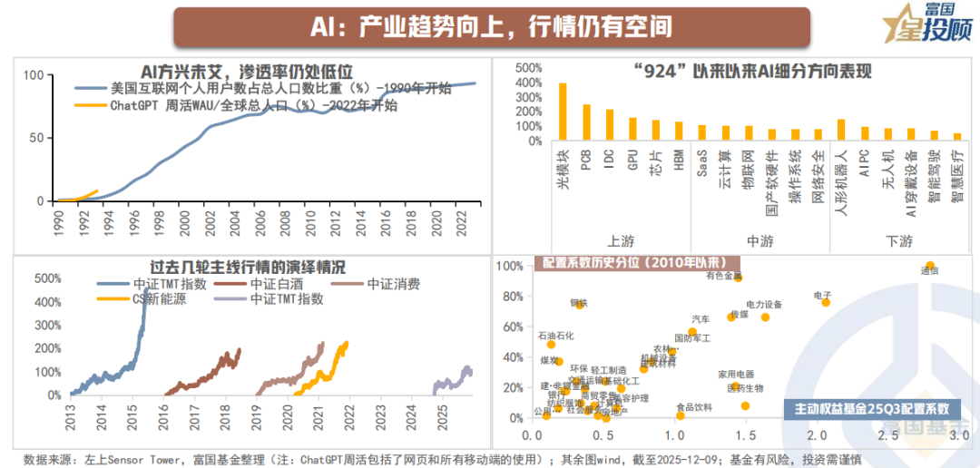 今年AI尤其是上游海外算力方向已积累可观涨幅,机构对TMT的配置也来到历史高位,极致结构或带来短期行情的波折。不过,目前AI的渗透率大概在10%左右,而参考2000年互联网和2015年移动互联网的经验,10%渗透率仅是大周期行情的起点,产业趋势大波段还有很大空间。同时对比历史上典型的产业周期带来的行情,本轮科技行情演绎的时间或空间也尚未到达极致。