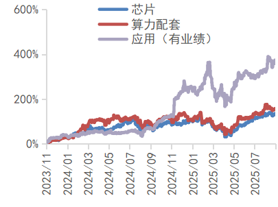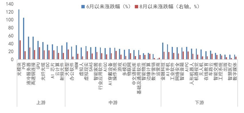 拆解AI产业链的上中下游,6月以来上游的光模块、PCB等海外算力链核心环节涨幅均超过100%,积累了较高的超额收益。随着8月DeepSeek正式发布新一代大模型DeepSeek-V3.1,与即将发布的国产新一代算力芯片高度契合,AI行情也从海外算力向国产算力等低位方向轮动扩散。借鉴海外,自去年三四季度以来,随着AI应用商业化得到初步验证,海外AI行情的交易主线已开始向中下游切换。聚焦国内,当前国产算力与应用端的行情或仍处在扩散逻辑的早期阶段,既有估值与涨幅的相对优势,又受益于产业政策、国产替代需求和应用场景加速落地的共振驱动。