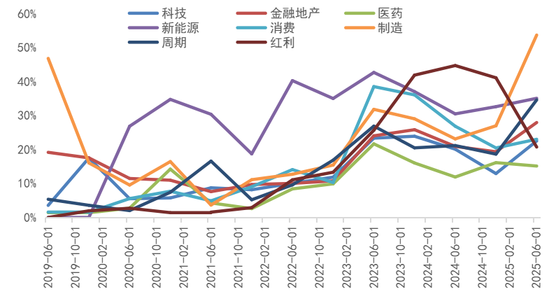 在行业主题与策略风格ETF的前十大持有人构成中,保险资金变化较为显著,通过"增科技、强制造、减红利"的组合拳,构建起与政策导向高度共振的配置版图。在科技、制造、周期类ETF中,保险资金持仓占比显著提升。以制造类ETF为例,前十大持有人中保险资金的持仓规模从2024年底的33亿元增长至2025年6月底的142亿元,占比由27%提升至54%,成为该类ETF的主导机构力量;科技类ETF同样获得重兵布局,前十大持有人中保险资金的持仓规模从94亿元增长至223亿元,占比由13%提升至23%。与之相对的是红利类ETF的持仓腰斩,前十大持有人中,保险资金持有规模由192亿元大幅降至100亿元,占比由41%降至21%。