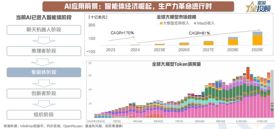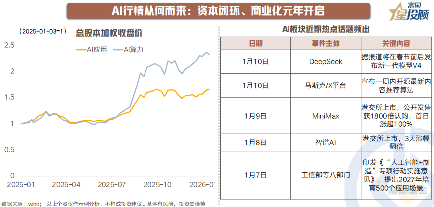 2025年,AI行情热点集中在AI硬件,AI应用相对弱势。进入2026年后,资本市场协同技术与产品助力行情向AI应用切换。资本市场方面,智谱和MiniMax先后上市,不仅解决AI行业的融资问题,更为一级市场提供了定价锚,标志着行业从“烧钱研发”进入“价值兑现”新阶段。