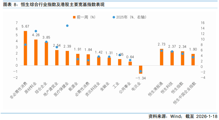 过去一周,港股市场延续年初以来的强势格局,主要指数全线收涨。恒生指数周涨幅达2.34%,恒生中国企业指数上涨1.90%,恒生科技指数表现尤为亮眼,录得2.37%的涨幅。从行业层面看,非必需性消费(+5.67%)、原材料业(+4.26%)和综合企业(+3.85%)领涨,而电讯业(-1.34%)、公用事业(+0.64%)及工业(+1.05%)则相对落后。南向资金全周合计净买入100.46亿港元,显示内资对港股配置意愿持续增强。此轮行情的核心驱动在于内外部宏观环境同步改善。海外方面,美国通胀数据超预期回落强化了美联储降息预期;国内方面,出口数据强劲、政策红利持续释放,叠加“十五五”开局之年的产业导向明确,共同提振市场风险偏好。非必需性消费与原材料板块的强势,一方面受益于全球制造业周期回暖带动的大宗商品价格走强,另一方面也反映出投资者对消费复苏与品牌出海逻辑的再定价。