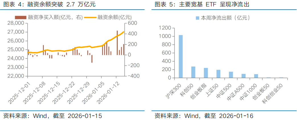 自12月中旬启动的本轮春季行情,资金端“长钱托底、活跃资金抢跑、机构增配预期”共振,市场情绪短期过热,本周监管出手降温,意在平滑波动而非扭转趋势,为市场“慢牛”保驾护航。资金供需是快变量这一特征在春季行情中尤为突出,12月重要机构投资者持续增持A500ETF等宽基品种为市场带来稳定增量资金,市场赚钱效应改善后游资、杠杆资金等活跃资金布局意愿快速升温,至1月15日,融资余额突破2.7万亿元,屡创历史新高;同时人民币升值带来的外资回流和险资“开门红”配置需求等增量资金预期也在抬升市场做多情绪,最终沪指录得十七连阳(截至本周一),市场成交额连续4个交易日破3万亿元,市场情绪短期过热,且活跃资金加速流入商业航天等产业主题也带来结构非理性上涨。在此背景下,本周监管出手降温:本周三中午,沪深北三大交易所齐发通知——将融资保证金最低比例从80%提高至100%;国家队重仓的多只宽基ETF也呈现净流出状态。不过,本次融资保证金比率仅限于新开融资合约,调整实施前已存续的融资合约及其展期仍按照调整前的相关规定执行。中国证监会15日召开的2026年系统工作会议也提出,全方位加强市场监测预警,及时做好逆周期调节,强化交易监管和信息披露监管,进一步维护交易公平性,严肃查处过度炒作乃至操纵市场等违法违规行为,坚决防止市场大起大落。监管出手的核心诉求并非改变趋势,而在于逆周期调节,防范快牛引发的市场波动风险,为“慢牛”行情保驾护航。
